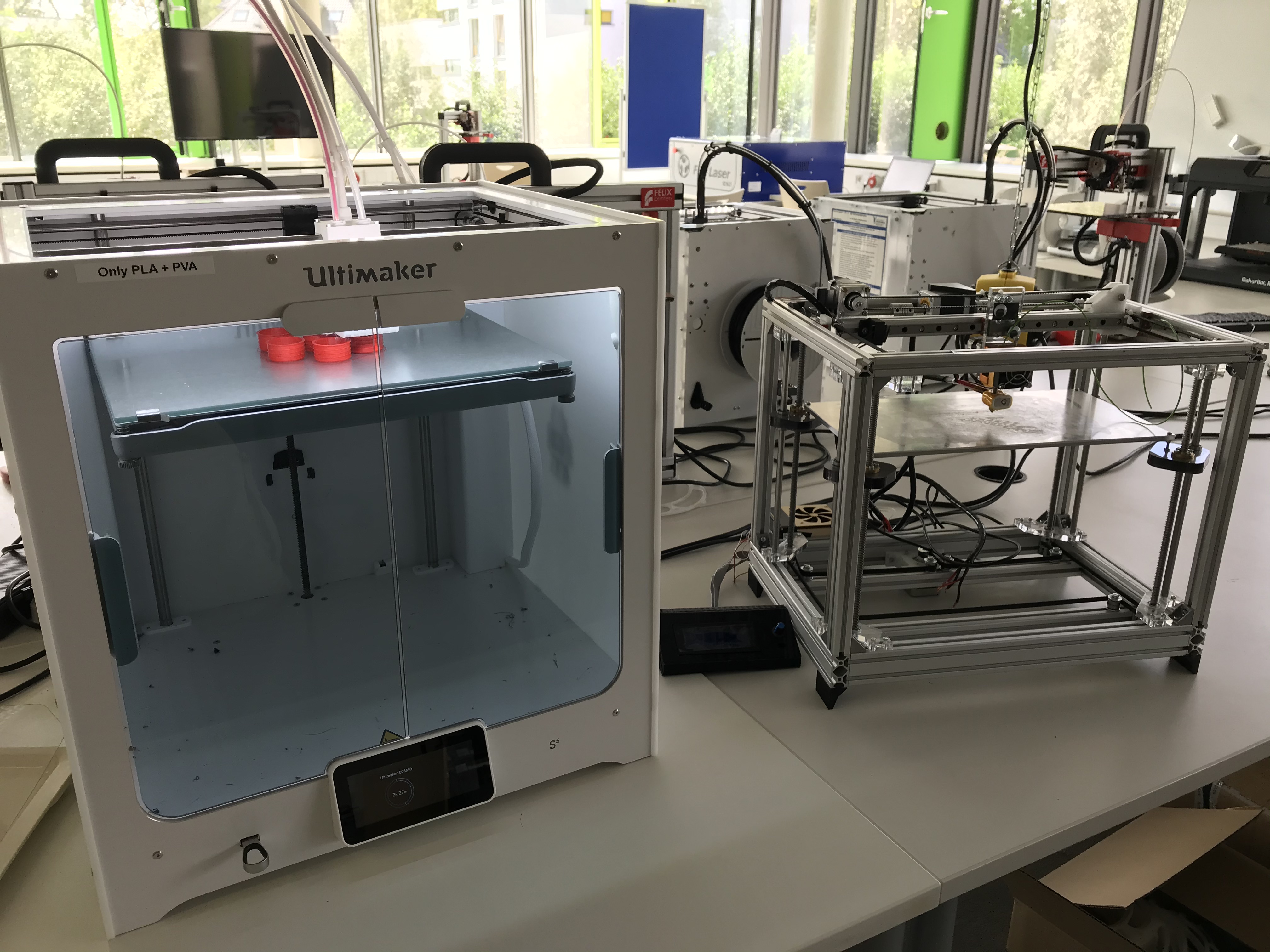 Abb. 3:Schüler*Innen-Workshop am FabLab Kamp-LintfortAbb. 4: Industriell (links) und selbstgefertigter (rechts) 3D-Drucker