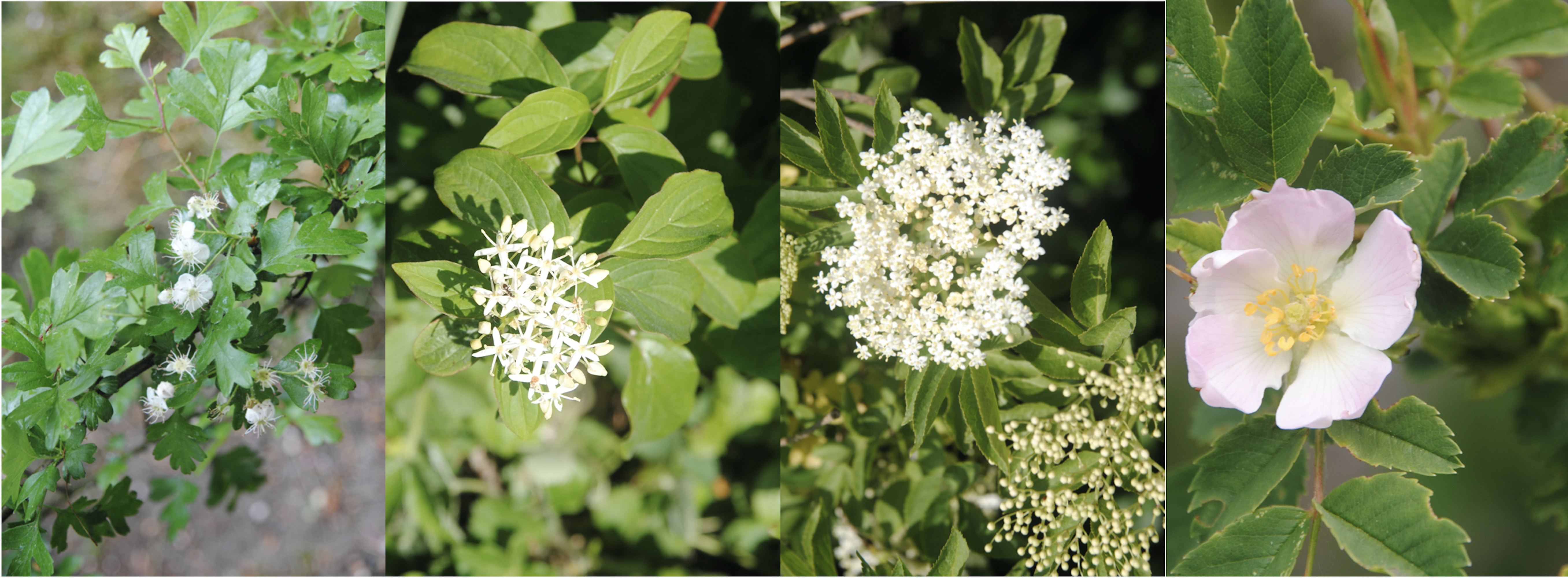 Abb. 1: Typische Heckenpflanzen, die Insekten und Vögeln Nahrung in Form von Blüten und Früchten bieten (von links nach rechts: Weißdorn (Crataegus monogyna), Roter Hartriegel (Cornus sanguinea), Schwarzer Holunder (Sambucus nigra) und Hundsrose (Rosa canina)).