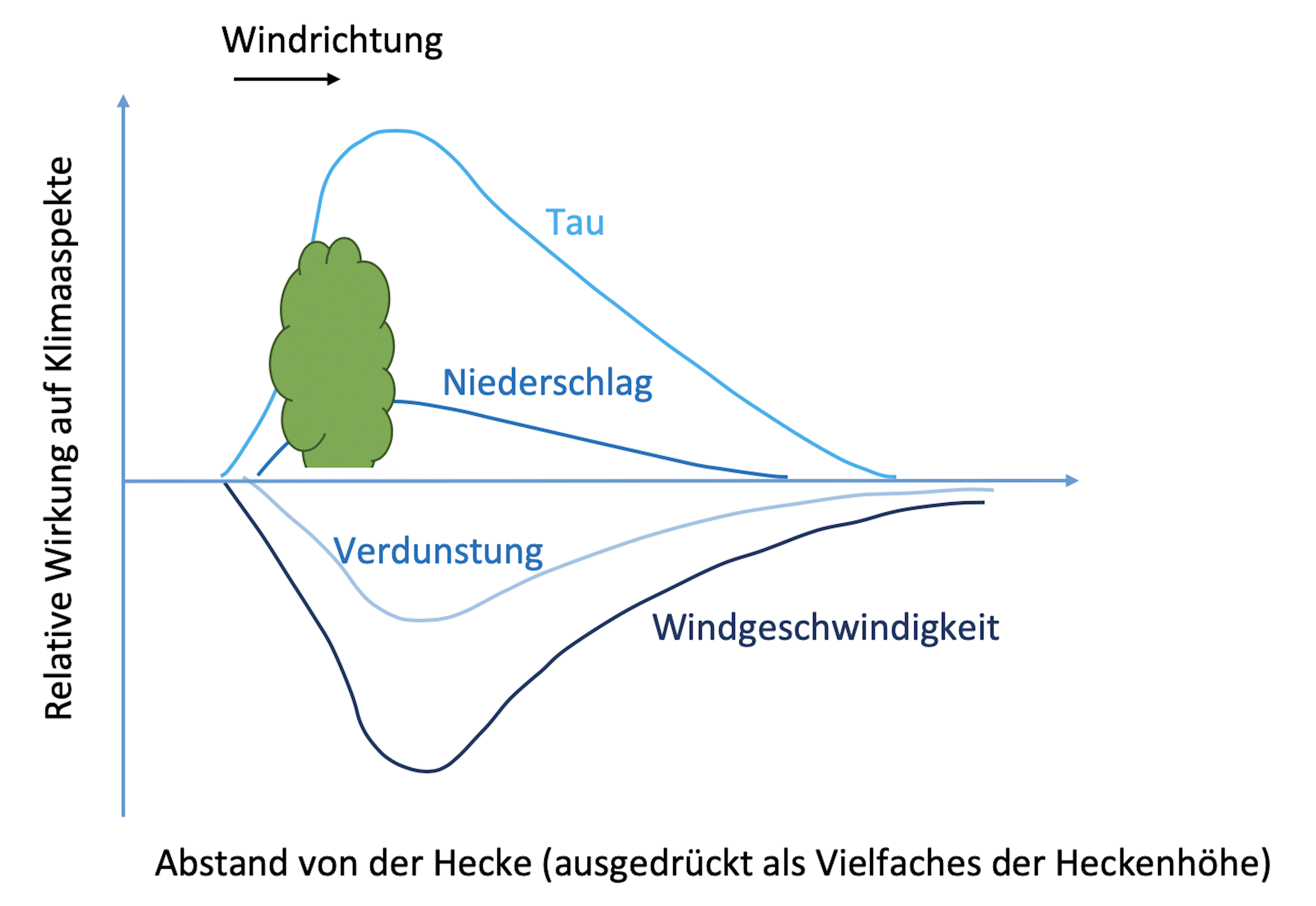 Der Mensch beeinflusst Ökosysteme in vieler Hinsicht, besonders herausfordernd sind die Auswirkungen menschlichen Handelns auf die Artenvielfalt (Biodiversität) und auf Stoffkreisläufe (z. B. auf Nährstoffkreisläufe durch den Einsatz von Wirtschaftsdüngern und auf den Kohlenstoffkreislauf durch die Nutzung fossiler Energieträger und den damit verbundenen Klimawandel). Bei beiden Herausforderungen können Hecken nützliche Dienste erweisen. Viele Studien haben gezeigt: Hecken beeinflussen die Standortbedingungen auf angrenzenden Ackerflächen überwiegend positiv (Abbildung 2). Hecken und Feldgehölze bieten vielfältigen Nutzen, sie lieferten nicht nur in der Vergangenheit wichtige Rohstoffe (Holz, Heckenschnitt). Sie bieten Windschutz, dies ist vor allem dann wichtig, wenn der Boden noch nicht mit Kulturpflanzen bewachsen ist, um Verluste von fruchtbarem Ackerboden zu vermeiden (Abbildung 3).
