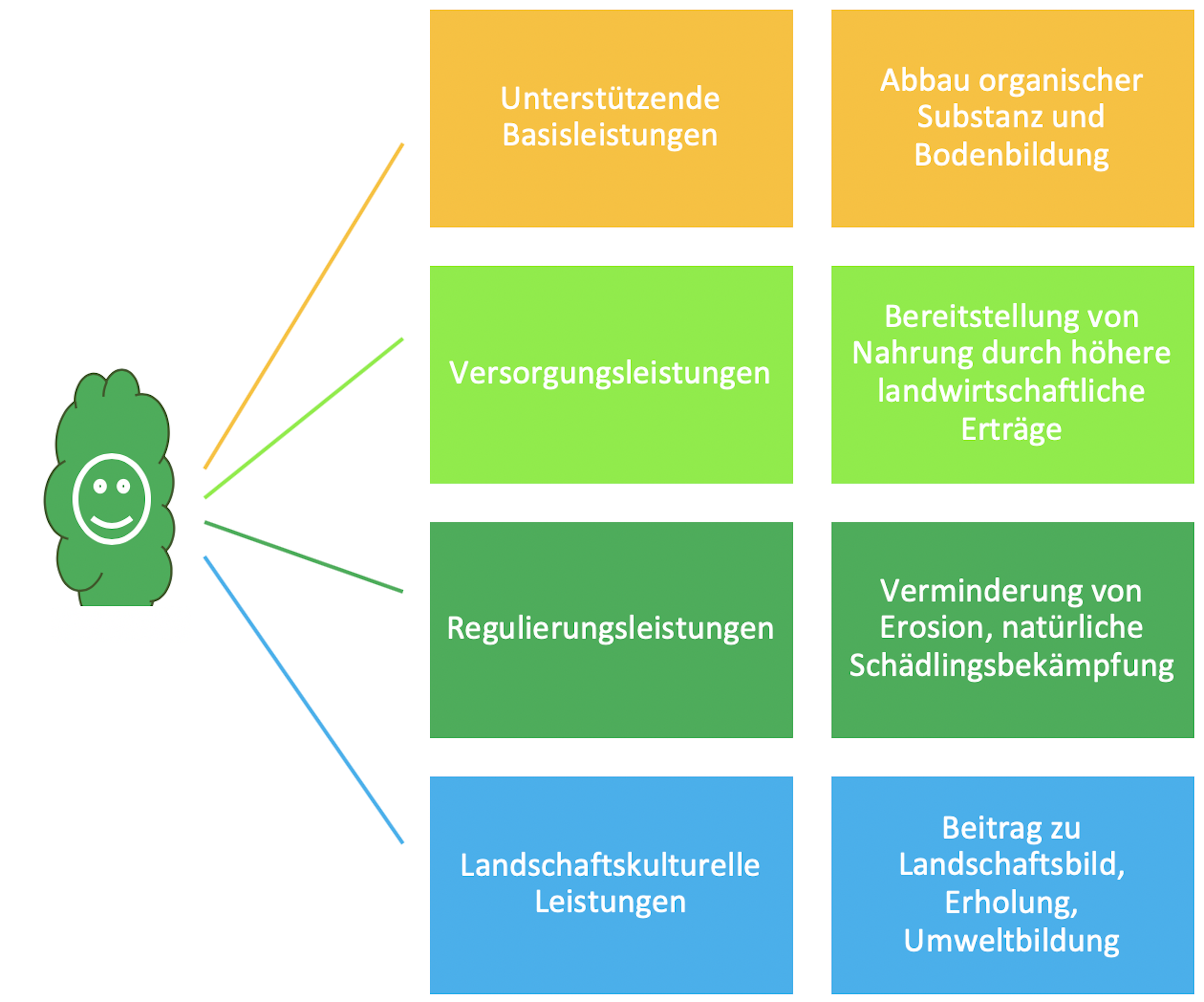 Quellen: Naturkapital Deutschland – TEEB DE, 2016. Ökosystemleistungen in ländlichen Räumen – Grundlage für menschliches Wohlergehen und nachhaltige wirtschaftliche Entwicklung. Schlussfolgerungen für Entscheidungsträger. Leibniz Universität Hannover, Helmholtz-Zentrum für Umweltforschung – UFZ, Leipzig.)