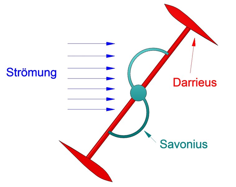 Abb. Darrieus-Rotor, kombiniert mit Savinius-Rotor. Quelle: https://de.wikipedia.org/wiki/Darrieus-Rotor, M. Göllner.