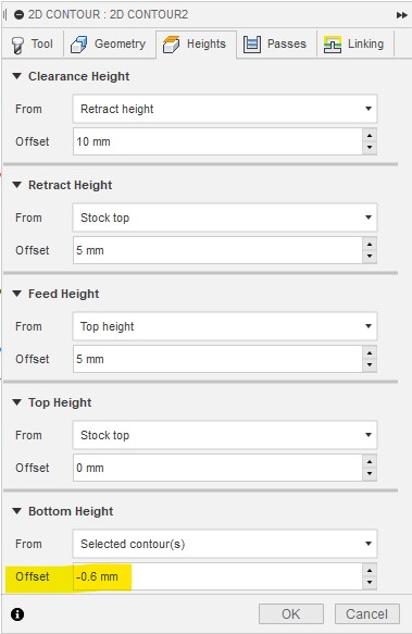 Im ersten Durchgang wählen wir 2D Pocket und geben das verwendete Werkzeug, den Vorschub und die Geschwindigkeit ein. Außerdem müssen wir die zu gravierenden Teile des Designs auswählen und die Eintauchtiefe in das Material festlegen. Um die Tiefe der Vertiefung festzulegen, muss die Dicke des Materials, das Sie verwenden wollen, im Voraus bekannt sein. Der Entwurf muss auch die Dicke des zu verwendenden Materials enthalten und entsprechend auf diese Dicke extrudiert werden. Die für das Schruppen/Gravieren verwendeten Parameter lauten wie folgt: