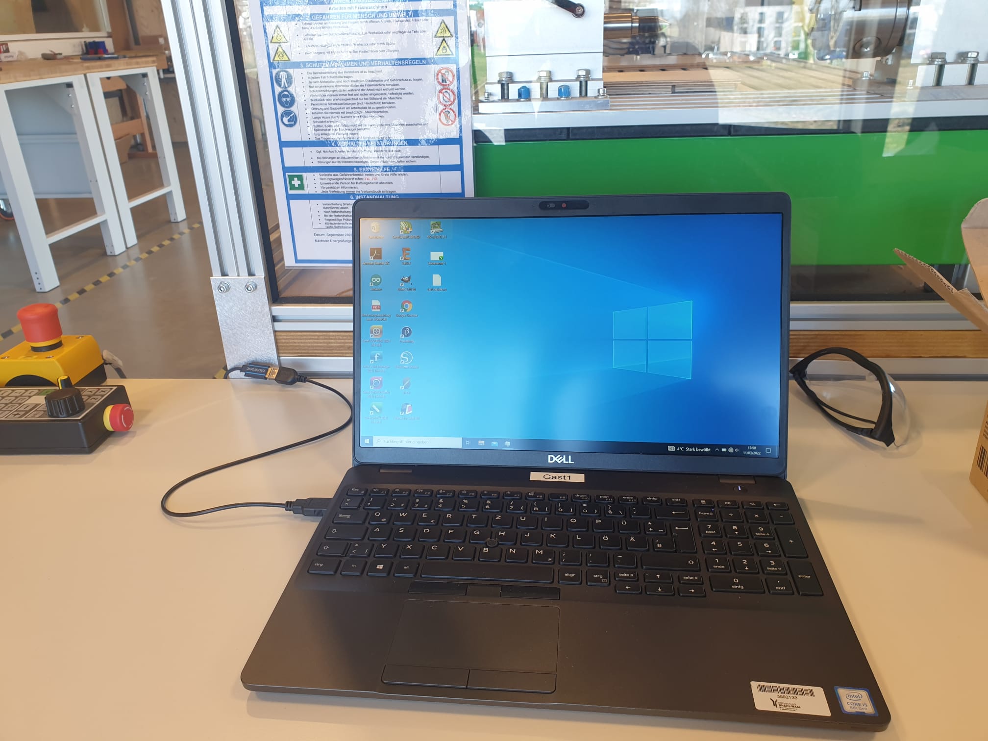 Als nächstes schließen wir den Gast1-Laptop an die Maschine an, schalten die CNC-Maschine ein und starten die Steuerung. Wenn die Türen der CNC-Maschine blockiert sind, lösen wir sie jetzt, indem wir auch die Taste im CNC-Bedienfeld benutzen.
