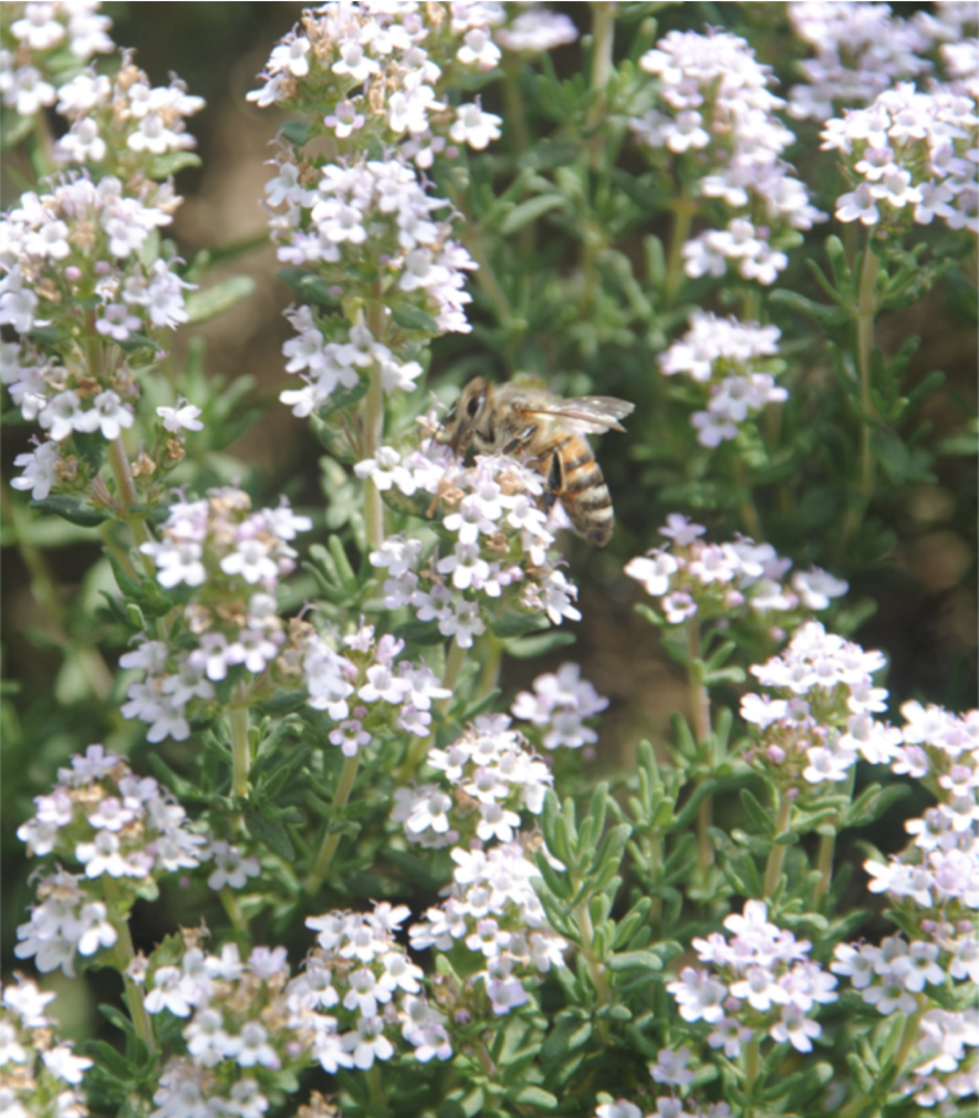 Here you can see a herb spiral built of bricks. Bricks are particularly suitable because they are weatherproof and very stable on the one hand and completely recyclable on the other. The special thing about a herbal spiral is the division into different layers. At the very bottom is the wettest layer. This is where plants that prefer a lot of water grow, such as tarragon. The middle layer is already somewhat drier and is therefore suitable for optimal for herbs like coriander, calendula and borage. In the uppermost and driest layer you can find lavender, sage, rosemary and oregano. Herbs prefer a rather sandy and nutrient-poor soil. Because of their flowers, the herbs you see here are an optimal food source for bees. Enjoy smelling the herbs, which not only many people like, but also the bees!