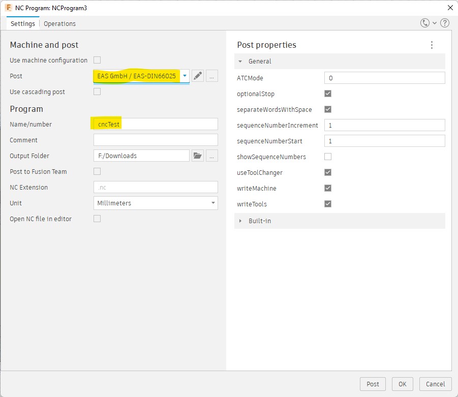 The last step is to generate the gcode for the CNC machine. It is important to choose the right Post Processor and select both processes set above. After these are checked, then we press post and we proceed with the cutting in the CNC machine.