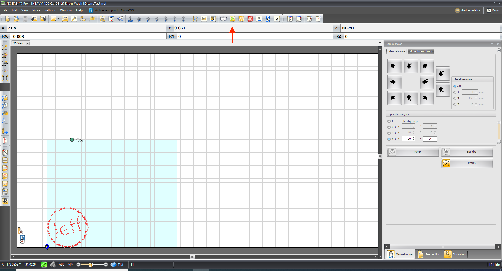 Lastly, we move on to the PC. We open the program following the NC program logo, we insert the file that we have prepared for cutting by File>Open and then we press Start either by pressing the button in the software or in the hand controller. Noticeable is when we open the program, on the right-hand side the control panel for the axes. They can also be moved by the software are mentioned before. For big steps, it is advisable to use the control in the software and for smaller increments, especially for the z-axis, it is better to use the hand controller as the increments there are way smaller. Very important is to make sure to block the doors before we press start, otherwise, the CNC machine will not start.