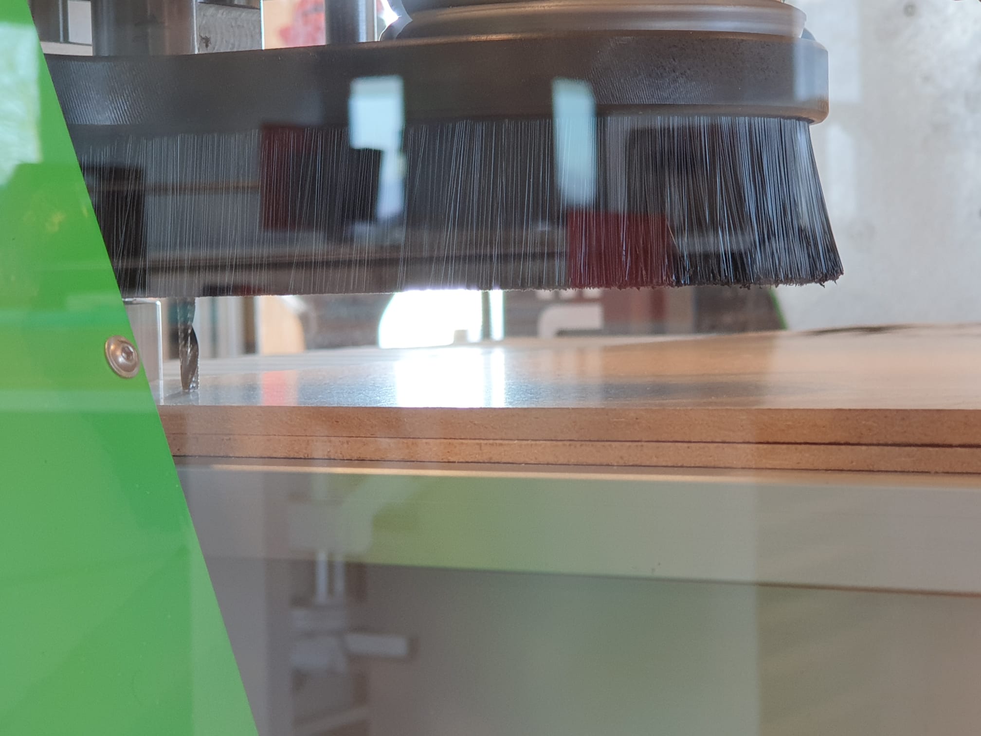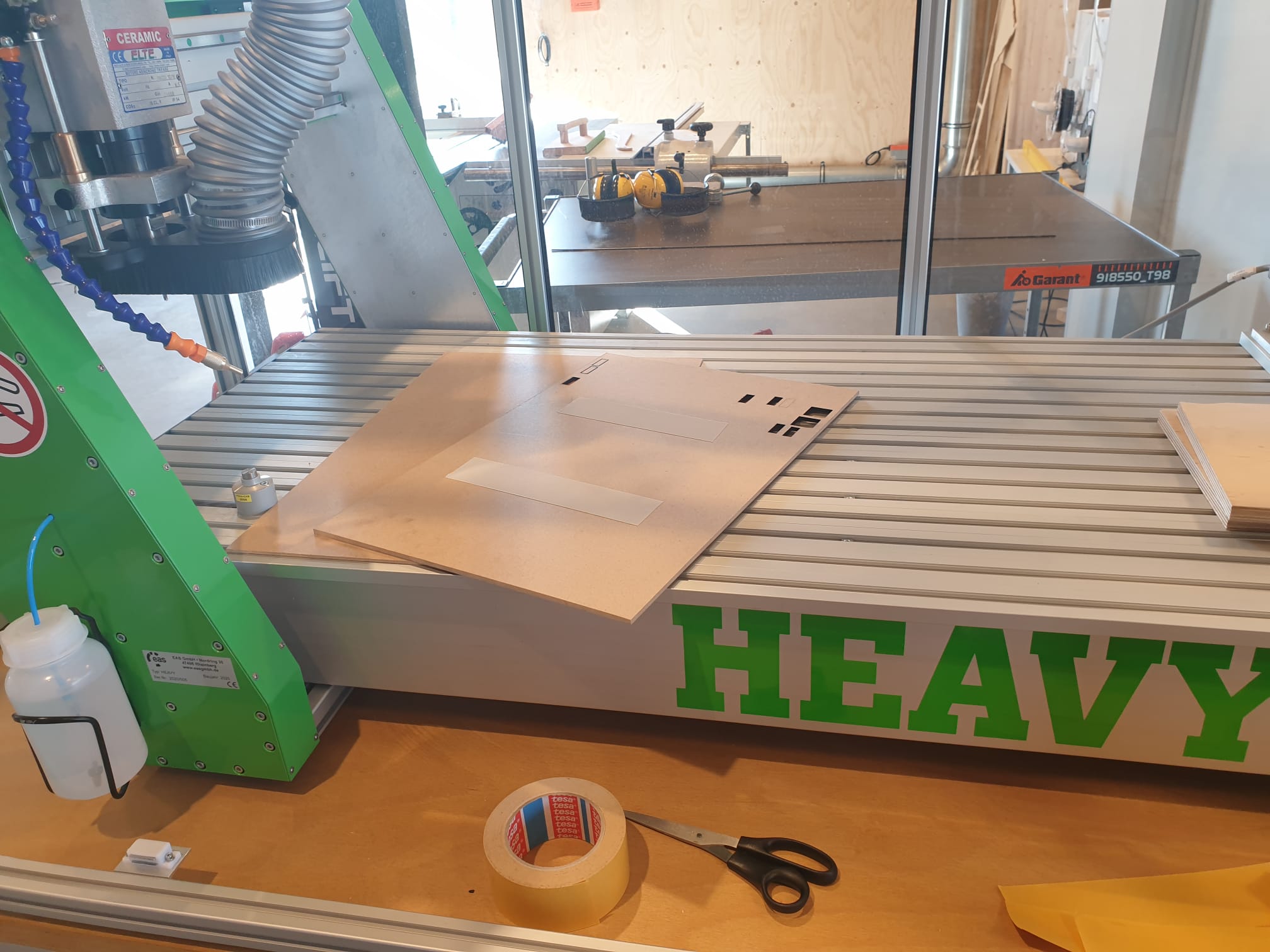 After releasing the doors, we place the first layer on the CNC bed as a protective layer, and then on it place the piece to be cut. To do that, double-sided tape was used for both layers.